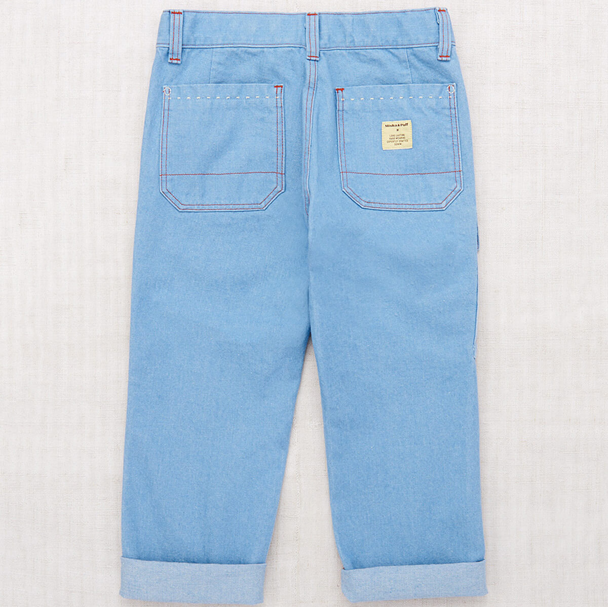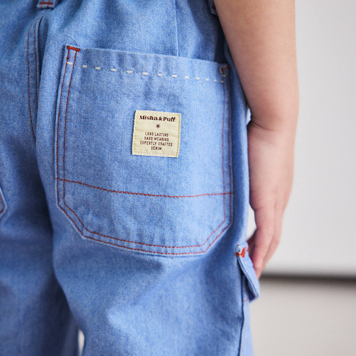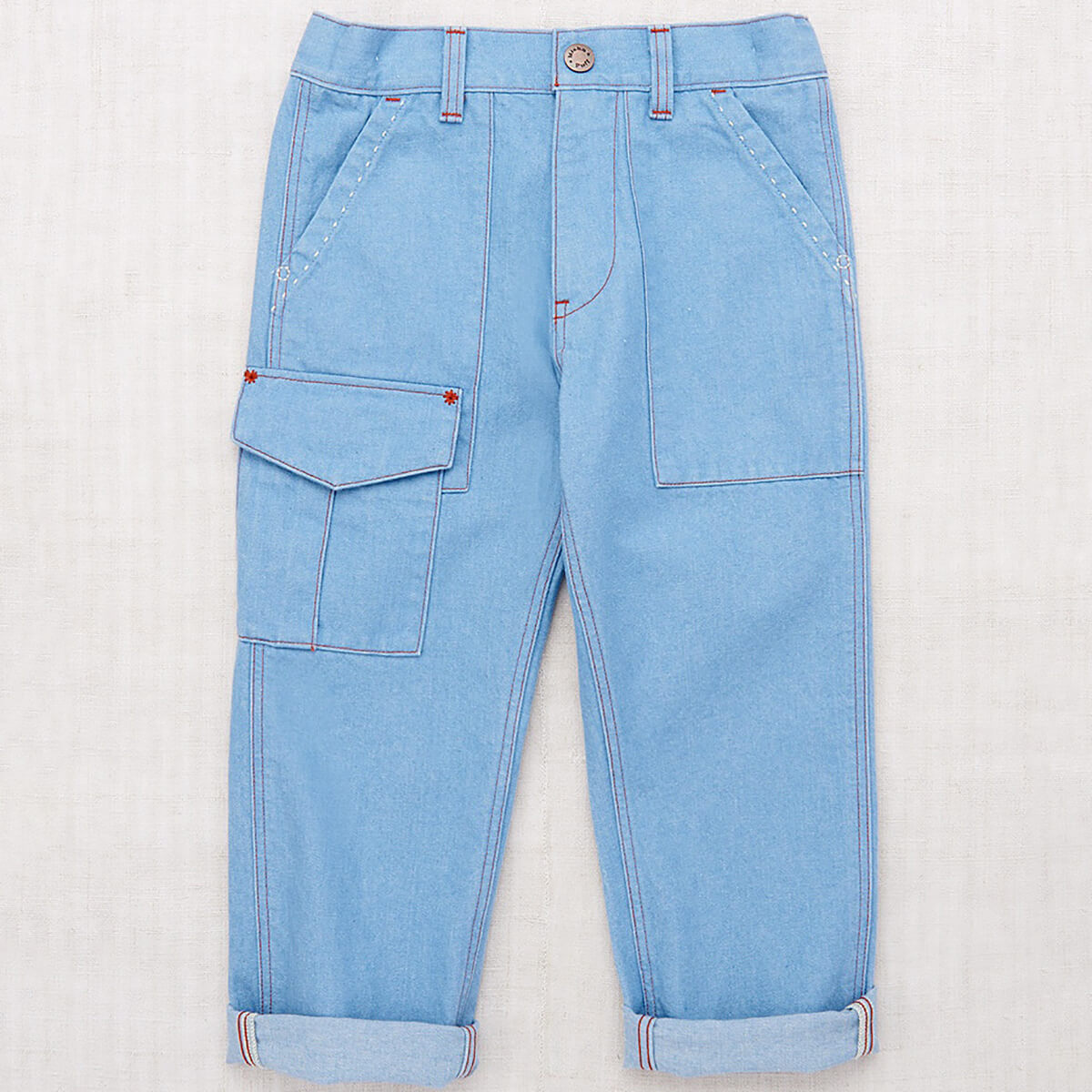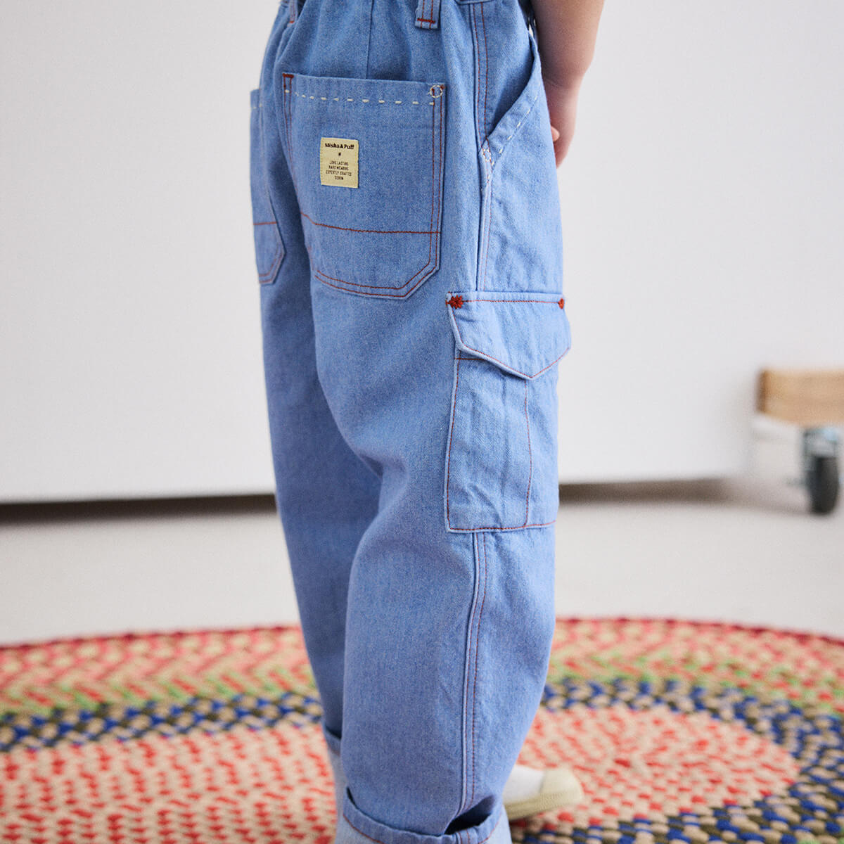 Utility Jeans by Misha & Puff. A relaxed tapered-leg jean in 100% cotton denim, with four standard pockets, one utility cargo pocket, contrast print lined pockets, contrast topstitch detail, and and interior adjustable cinched elastic waistband in the back for the perfect fit. Finished with hand-tacked stitches instead of rivets for softness.