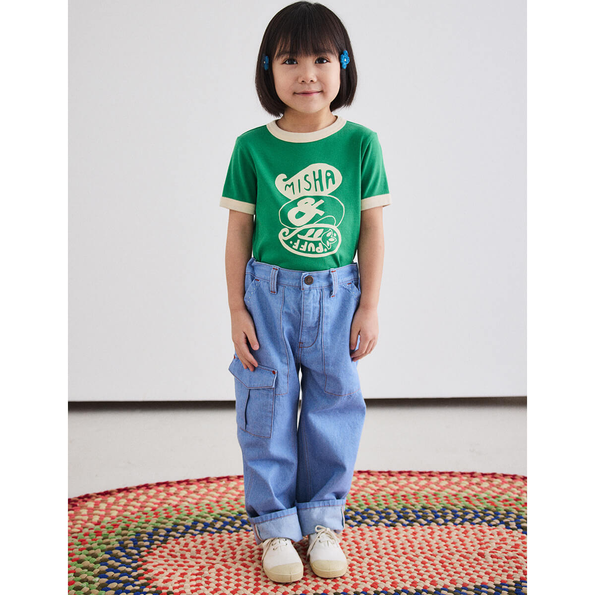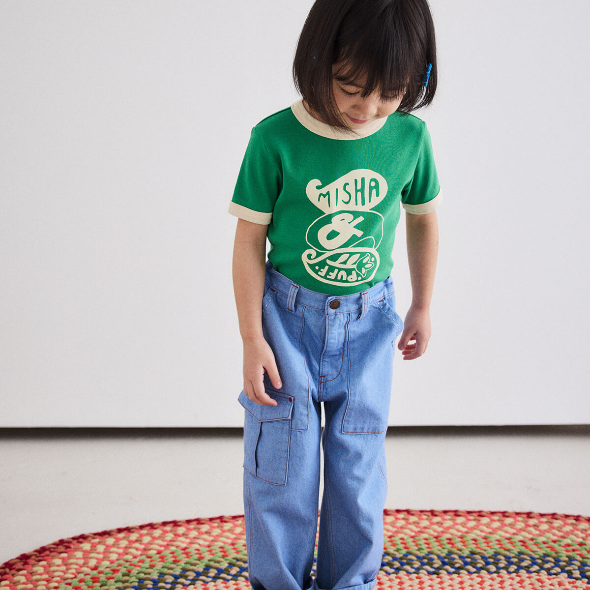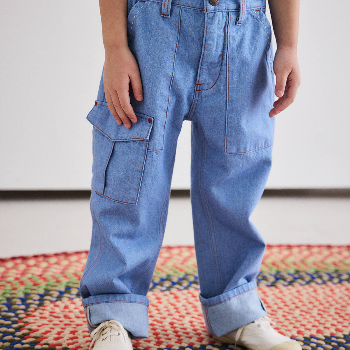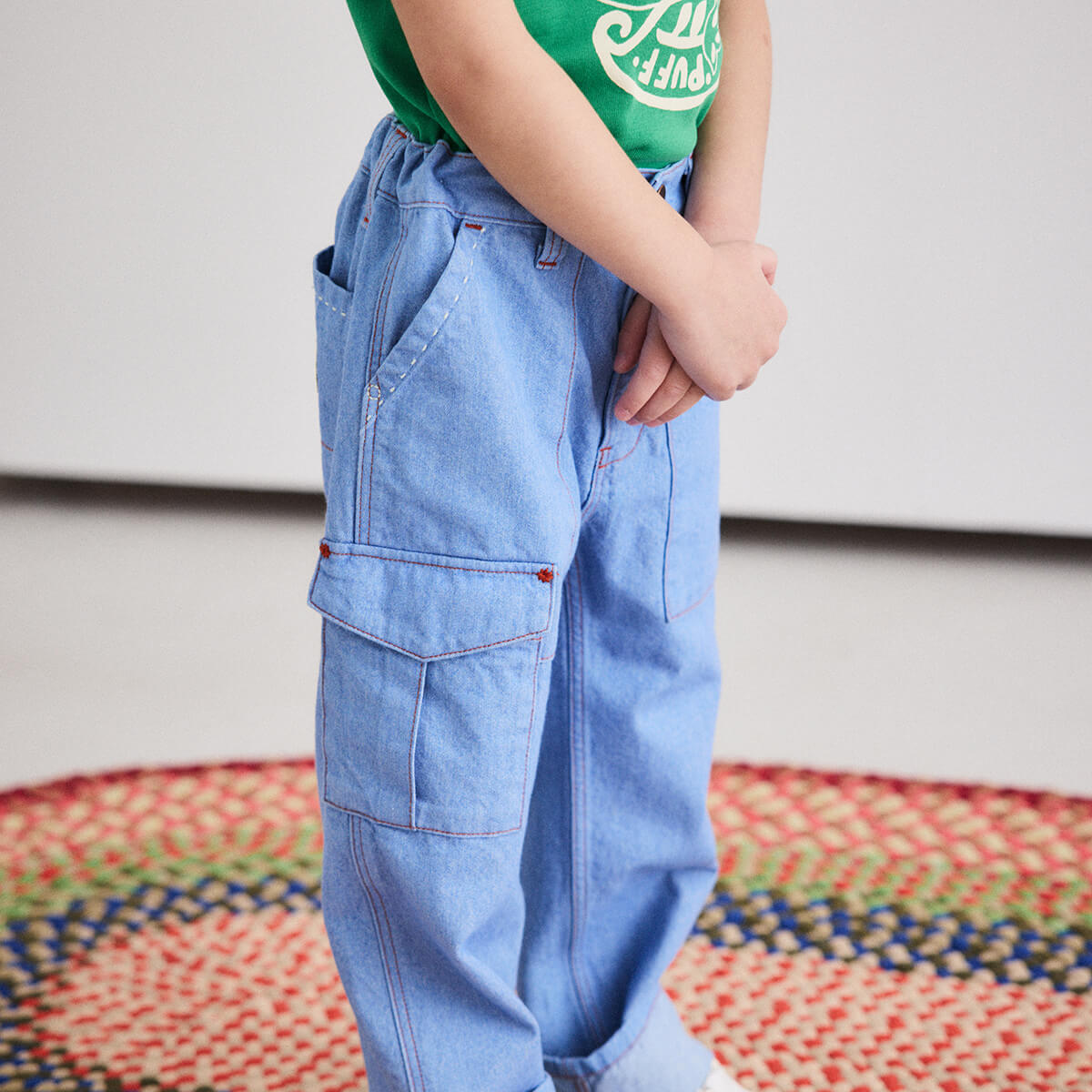 Utility Jeans by Misha & Puff. A relaxed tapered-leg jean in 100% cotton denim, with four standard pockets, one utility cargo pocket, contrast print lined pockets, contrast topstitch detail, and and interior adjustable cinched elastic waistband in the back for the perfect fit. Finished with hand-tacked stitches instead of rivets for softness.