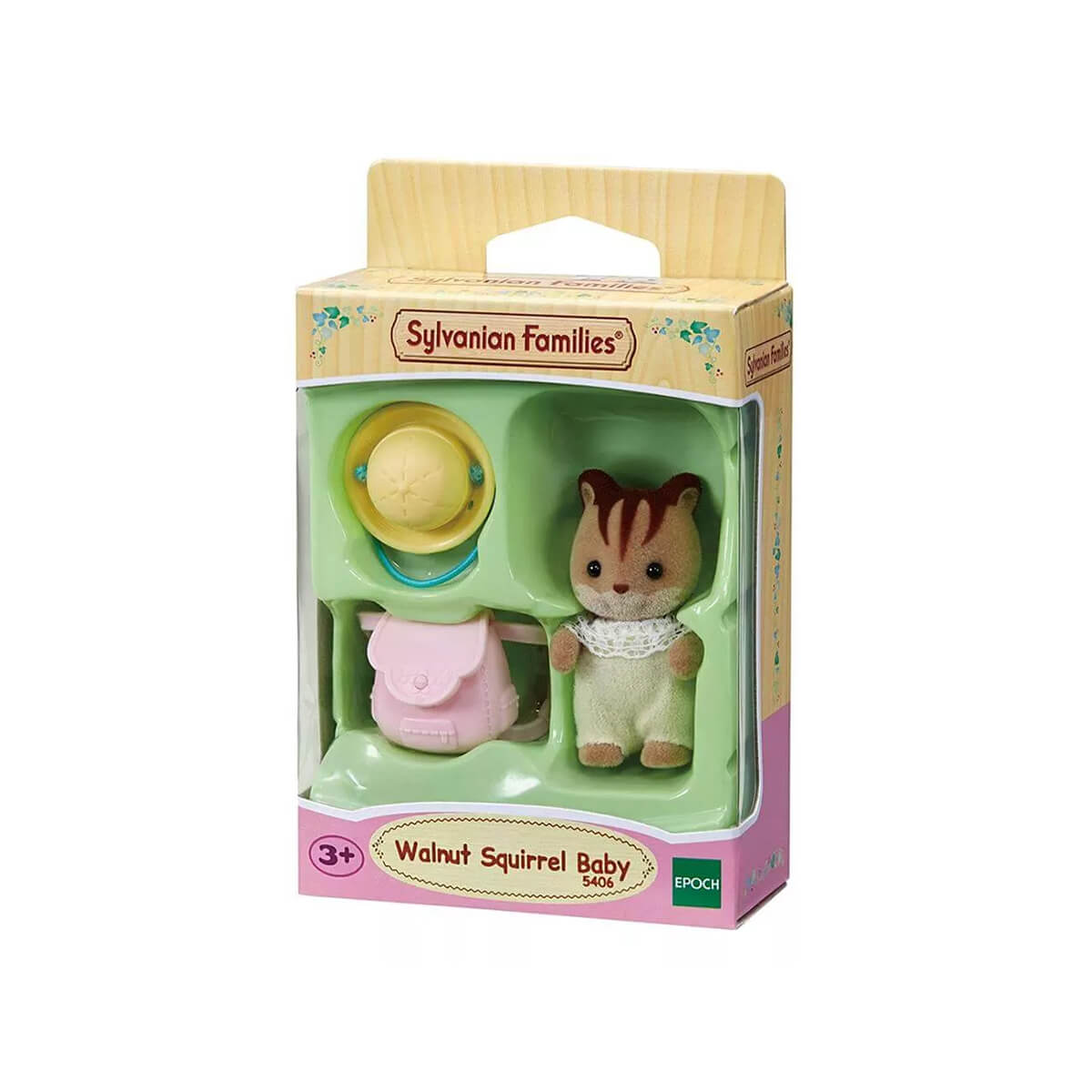Walnut Squirrel Baby by Sylvanian Families. Walnut Squirrel Baby Ambrose loves to bounce around and jump in puddles! Dressed in his smart new outfit with backpack and sun hat he is ready for another day or fun and adventure around Sylvania.