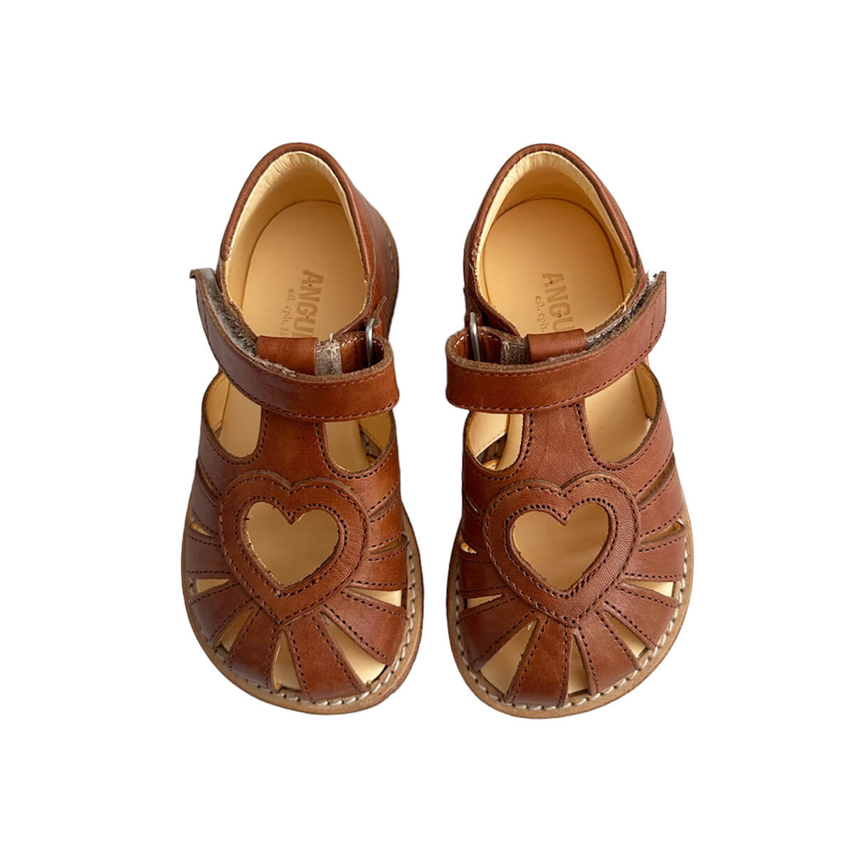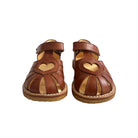 Leather starter sandals with heart cut out detail on the front by Angulus. T bar sandals with cut our heart detail and adjustable velcro strap. Closed toe and solid heel cap for maximum support. Soft and flexible crepe rubber sole. Lined with 100% chrome-free leather.
